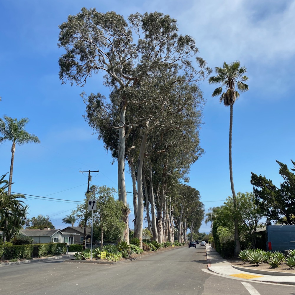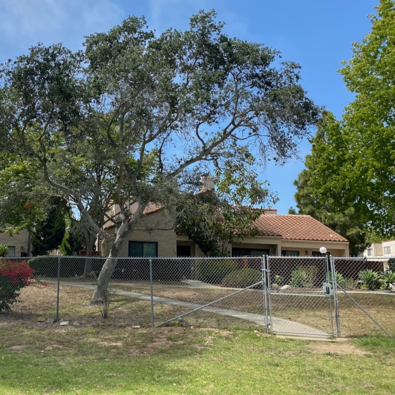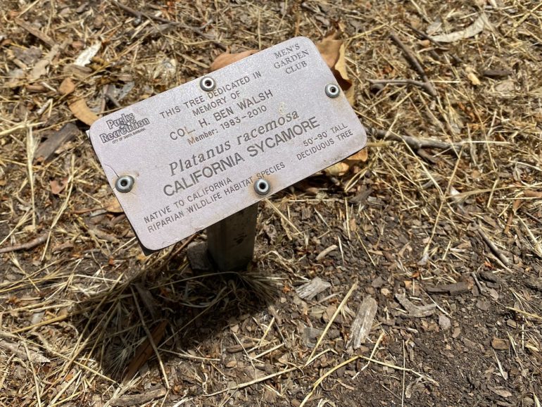 This was our first time in La Mesa Park, where there’s open space, a playground, some picnic areas, and, as you can see below, a gate from a certain apartment complex. I liked how trees have been dedicated to late members of the Men’s Garden Club, even if I’d prefer anything to a sycamore. They shed brown leaves for months.