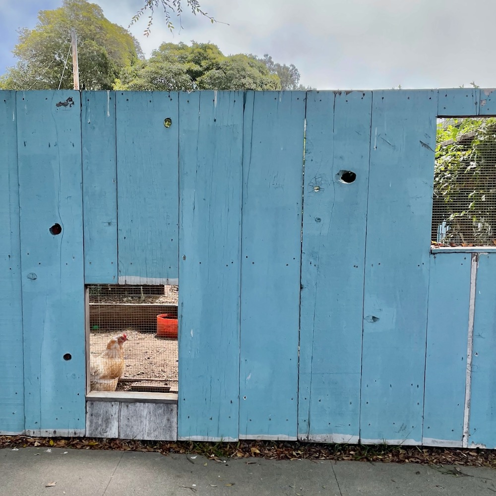 Across the street is a blue version of the same style of architecture—with windows in the fence for the chickens.