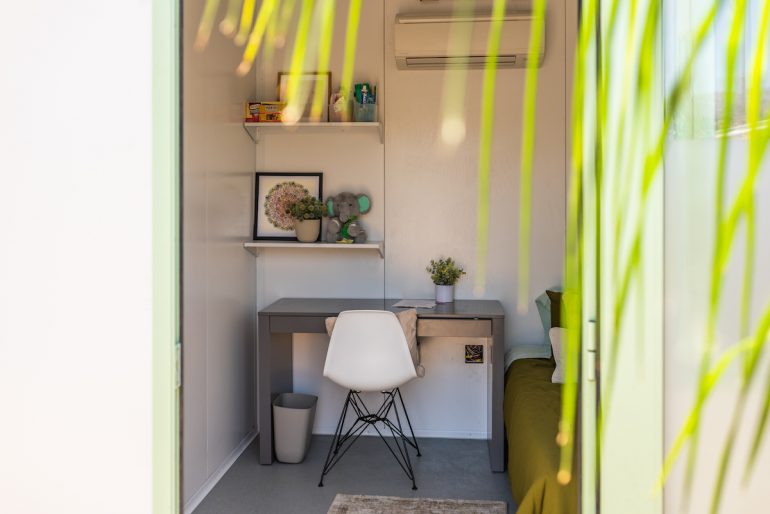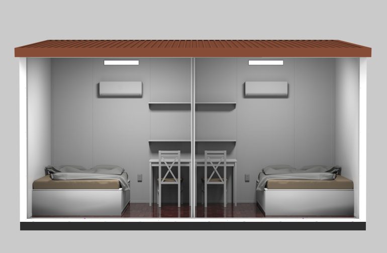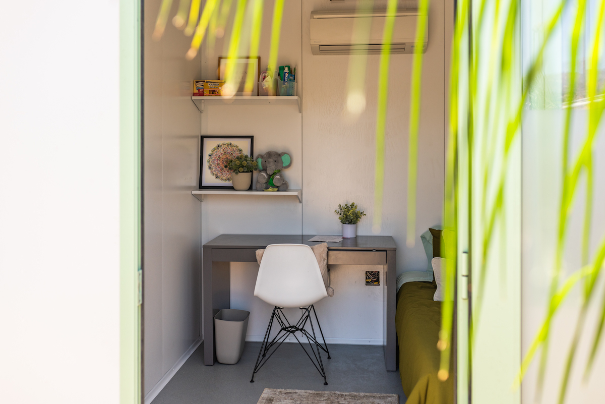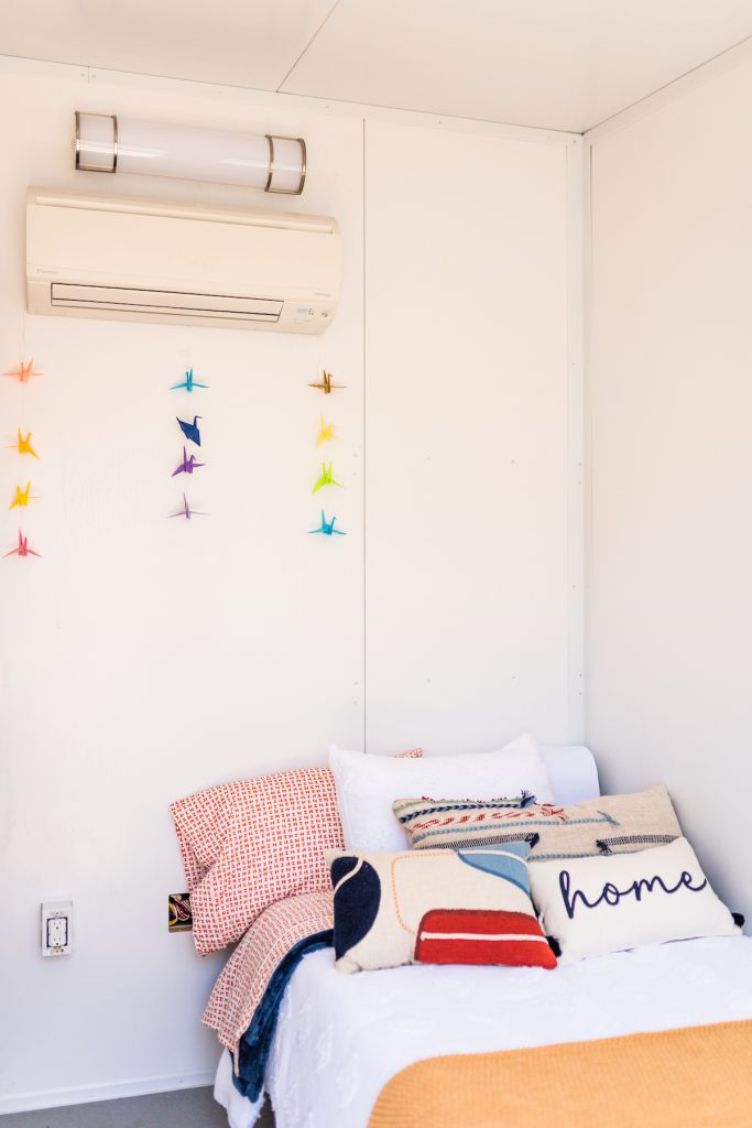 Each of the 35 rooms includes a bed, window (more than you can say about UCSB’s Munger Hall!), a desk, heating and air conditioning, and a lockable door. Locals contributed decorative items. Elsewhere on the property is a communal structure with bathrooms, laundry machines, a dining area, and a computer lab.