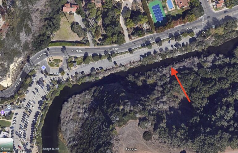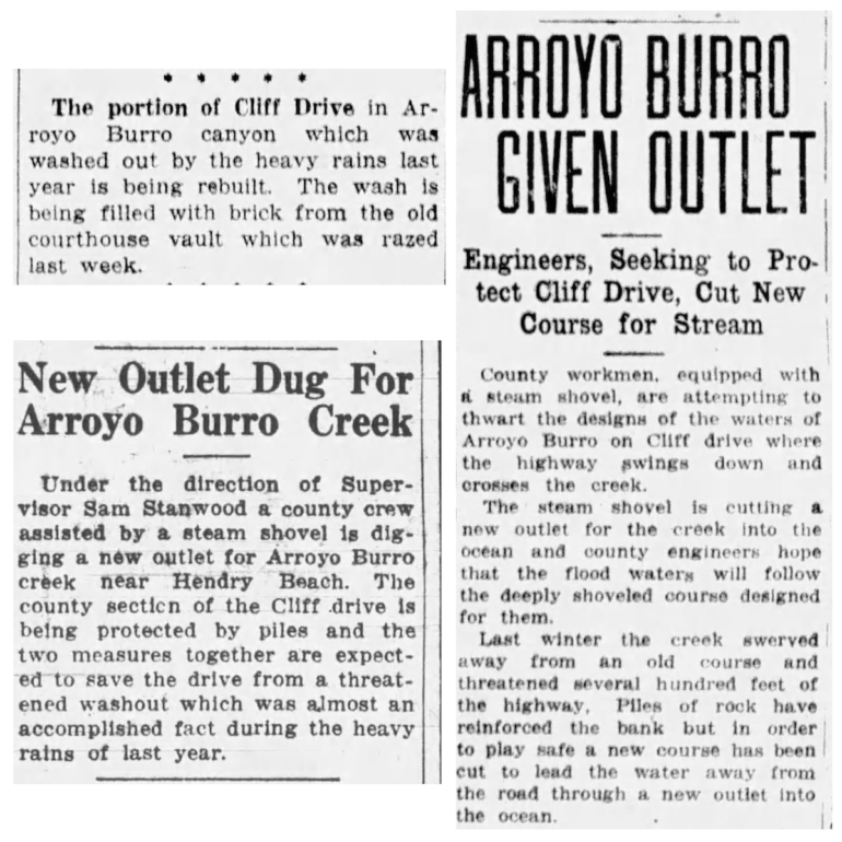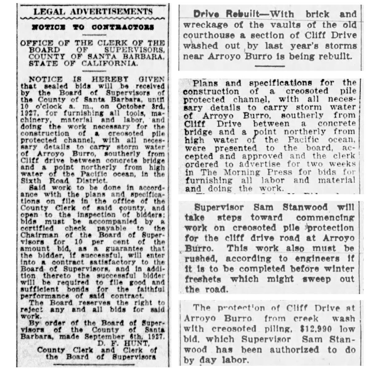 And Tom Modugno of Goleta History seconded that with more newspaper clippings: “In the winter of 1927, we had a lot of rain and part of Cliff Drive got washed away by the rushing creek waters. The county got right on it, dumping ‘brick from the old courthouse vault’ into the creek to try to divert it. (I’m guessing that would be brick from the old courthouse that was destroyed in the 1925 earthquake?) Then they got bids to build more of a structure with pilings and to redirect the creek away from the road. The bids came in too high, so the county did the work themselves. I’ve attached some articles and a photo from 1928.”