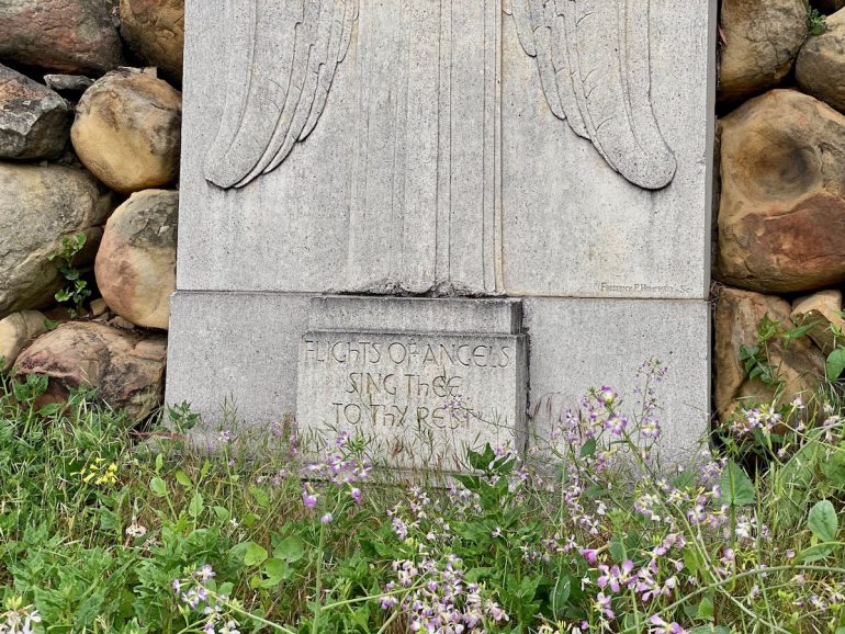 I assumed this would be a cinch to research online, but I found nothing beyond a brief mention on the MuleTrail blog. So I went and looked at the memorial in person. It has a quote from Hamlet (“Flights of angels sing thee to thy rest”), but neither a date nor a name, except for that of the sculptor, Frederick P. Humphrey.