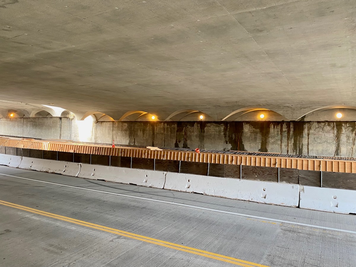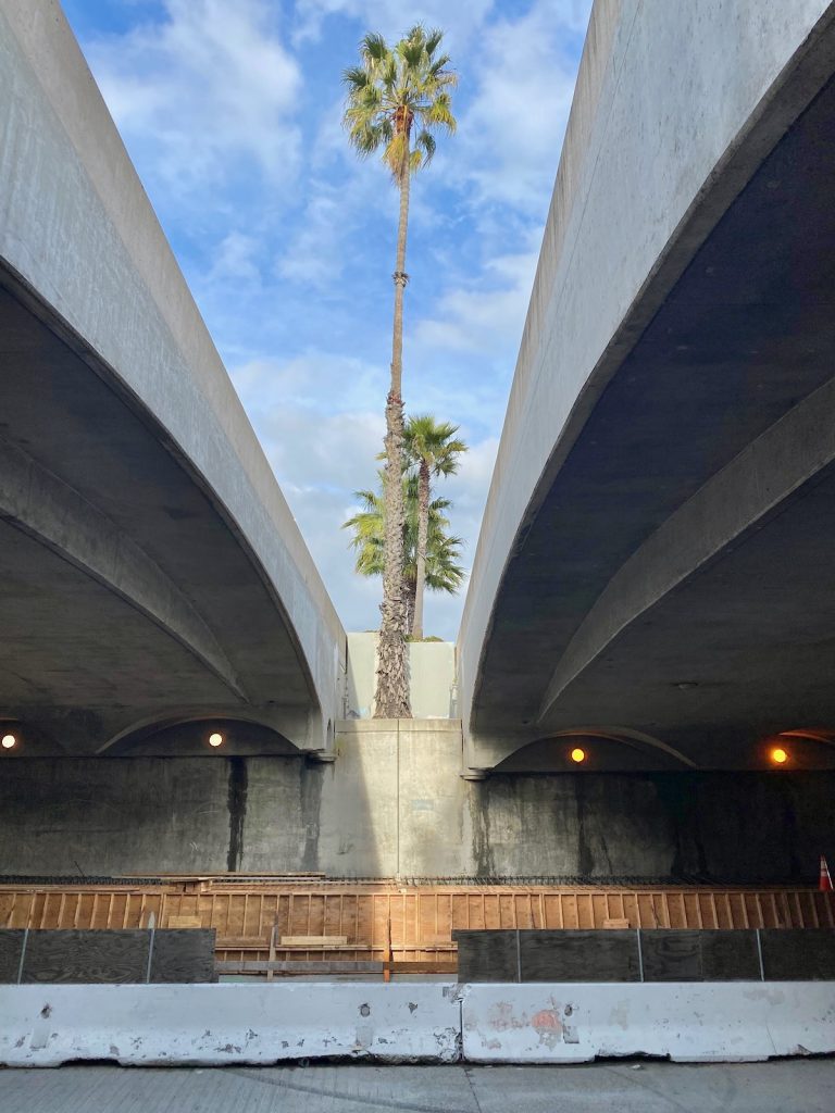 ••• The nonstructural columns in the State Street undercrossing have been removed, and I have to say (with no disrespect toward the Jeff Shelton ones coming to the space) that it looks kind of neat this way. Also, while walking under the freeway, I realized I should ask whether the palm trees visible in the middle will survive the renovation. Shelton says that his plans include them.
