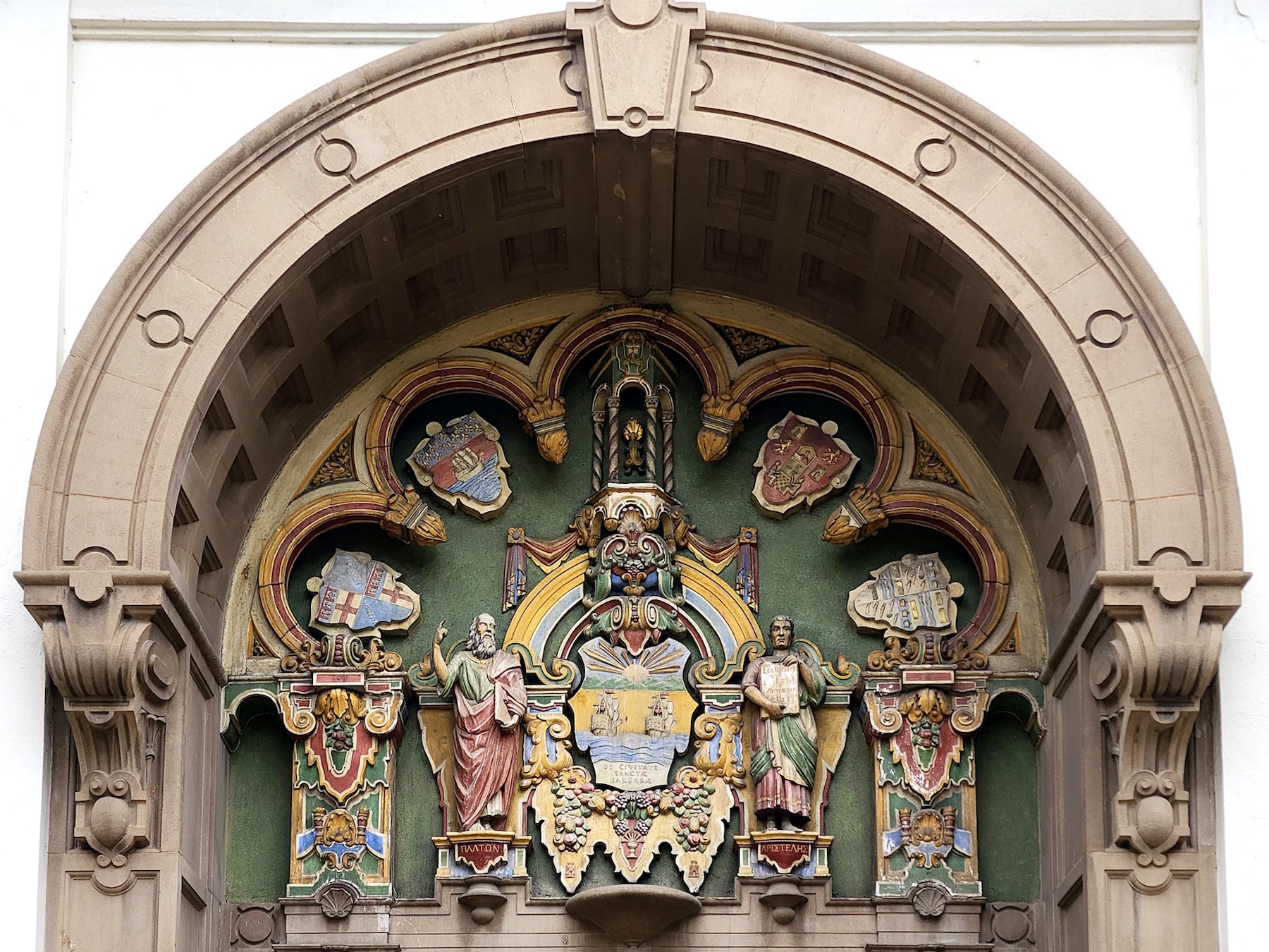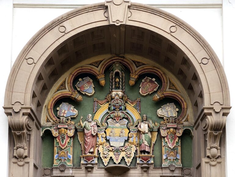 As for the meaning behind the images in the seal, we haven’t been able to find much documentation explaining why the bay, ships, and rising sun were specifically chosen. However, one possible clue comes from the City’s Coat of Arms, which appears in the tympanum at Central Library: