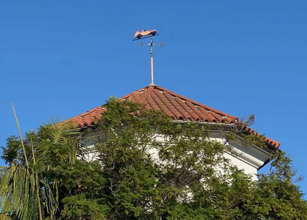At first thought I was thinking either mccormix gas on Calle Real at Padaro Lane or across the street at Bunny Phillips old garage where he kept his Bugattis autos as the weather vane looks like a Bugatti Royale