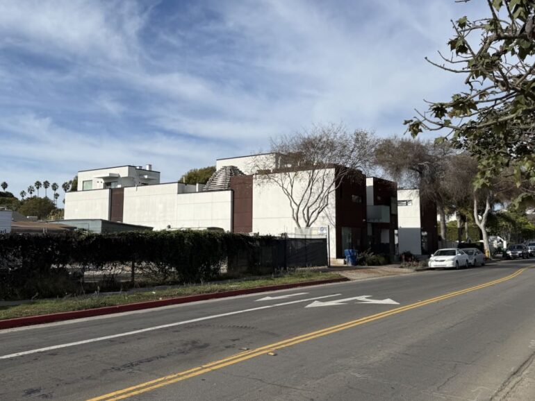 UPDATE: Congratulations to Cyndie Young for identifying this as 513 Garden Street. The complex is the Santa Barbara Center for Art, Science and Technology (“a creative design development community and vibrant arts incubator that supports artists, scientists, and technologists”), and the structure appears to be a sculpture.