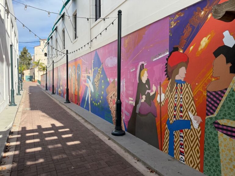 UPDATE: Congratulations to Raul for identifying this as the mural by Tracy Lee Stum and Sayak Mitra along the Plaza Granada passageway off State Street. It has a street sign that may or may not be official, but I can never remember the name.
