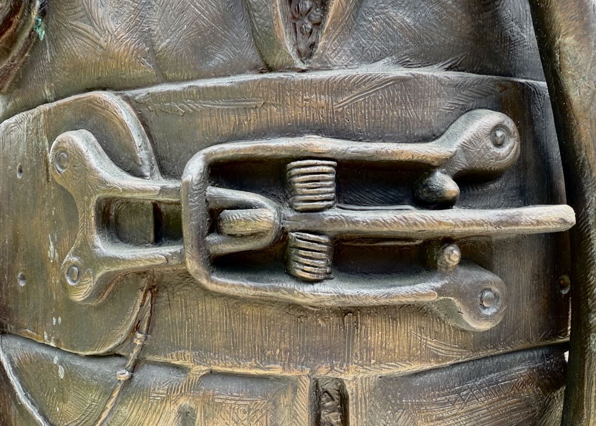 This is a close-up of the Santa Barbara Deepwater Diving Monument in the Santa Barbara Harbor. The photo is of the buckle for a Miller commercial diving weight belt. The public art sculpture was installed in April.