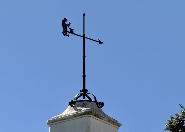 The blacksmith weather vane is on top of the building at 18 East Figueroa St, downtown. You can see it from the Figueroa entrance to La Arcada. Some years ago, I set up my easel in La Arcada and painted it.
