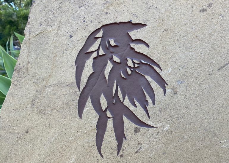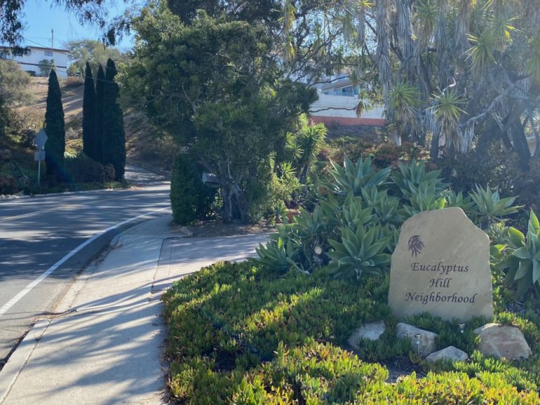 On the stone sign/marker announcing “Eucalyptus Hill Neighborhood” as you go up APS from the roundabout.