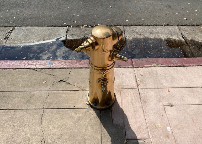 This gold fire hydrant is on east Figueroa Street near the entrance to La Arcada!