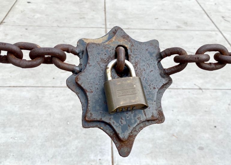 What a great, perfectly Santa Barbara lock!!! Total guess, by the old Presidio shopping center avenue driveway by where Frequency Wine has gone in.