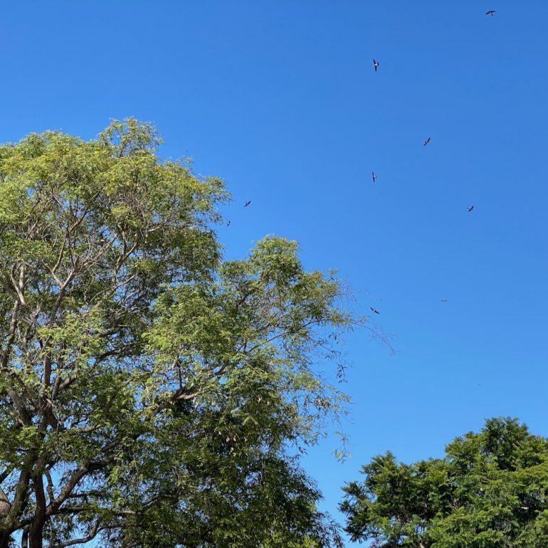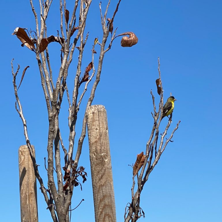 While this is not a walk you take to admire nature, I managed to also find a tree worth shooting, a flock of birds swarming amid a handful of trees, and a lesser goldfinch.