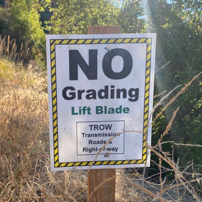 Indeed, it does. Southern California Edison will start work in the next couple of weeks on rebuilding the Edison Catway, a “transmission road” (allowing access to transmission towers) that runs from Buena Vista Trail to Cold Spring Trail and was damaged in the storms of 2023 and 2024. What was once wide enough for a vehicle is now a single-track trail in many places. The “no grading” signs appear at waterways, presumably so that crews won’t do anything to reroute the flow of water down the mountainside. Here’s hoping they look closely, for many of the signs have fallen over.