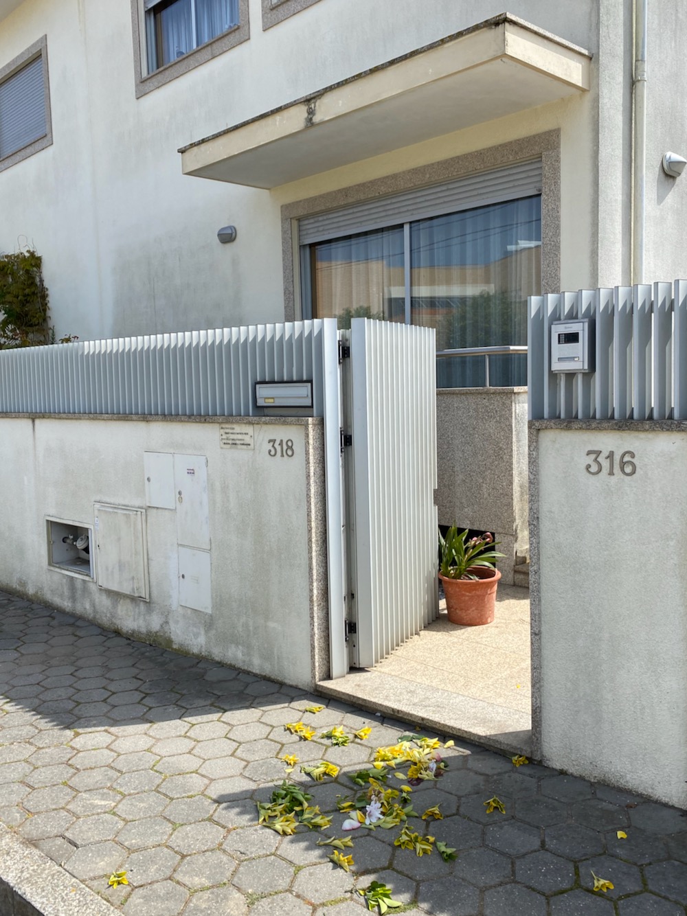 That said, we spent as little time as possible in the old town, despite its physical charm. One afternoon, we explored the upscale Foz neighborhood. (That tram comes within inches of the restaurant parklet.) And on our last day, which happened to be Easter, we went for a mammoth walk. We passed through parts of Porto I’m sure no tourist has ever seen, but once we got to the beach neighborhood of Miramar, the long boardwalk proved a welcome break from sidewalks and crowds. And in this part of Portugal, people leave flowers and leaves on their doorstep as a sign they welcome the local religious procession.