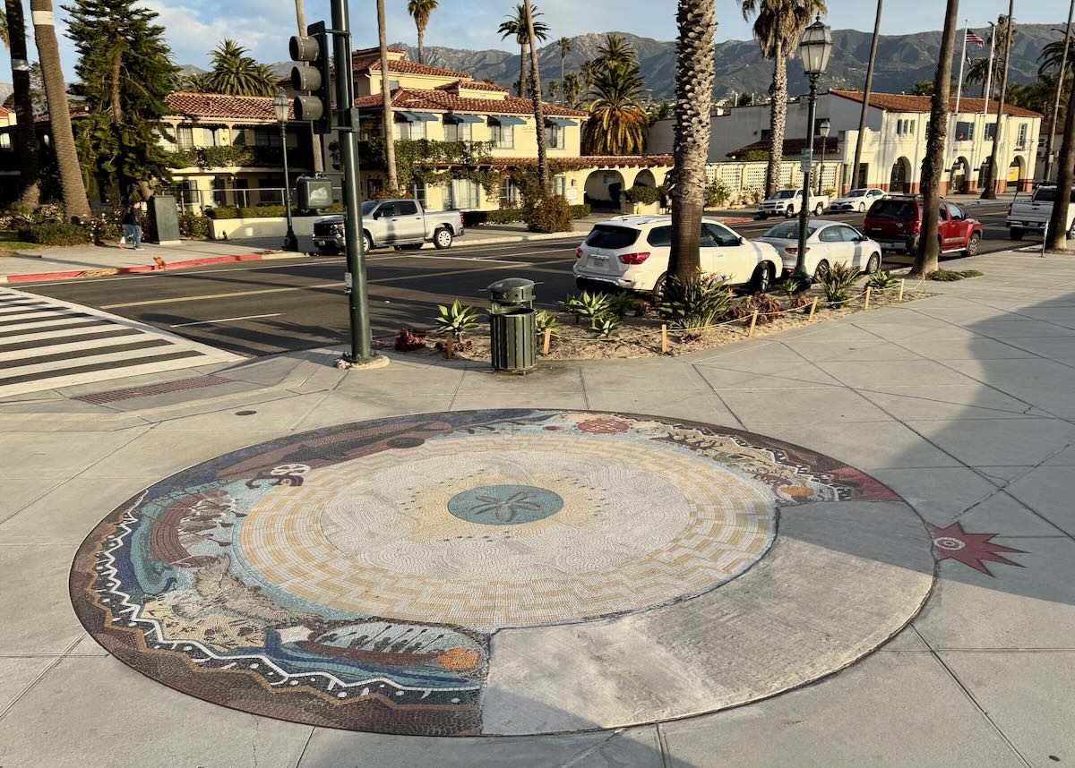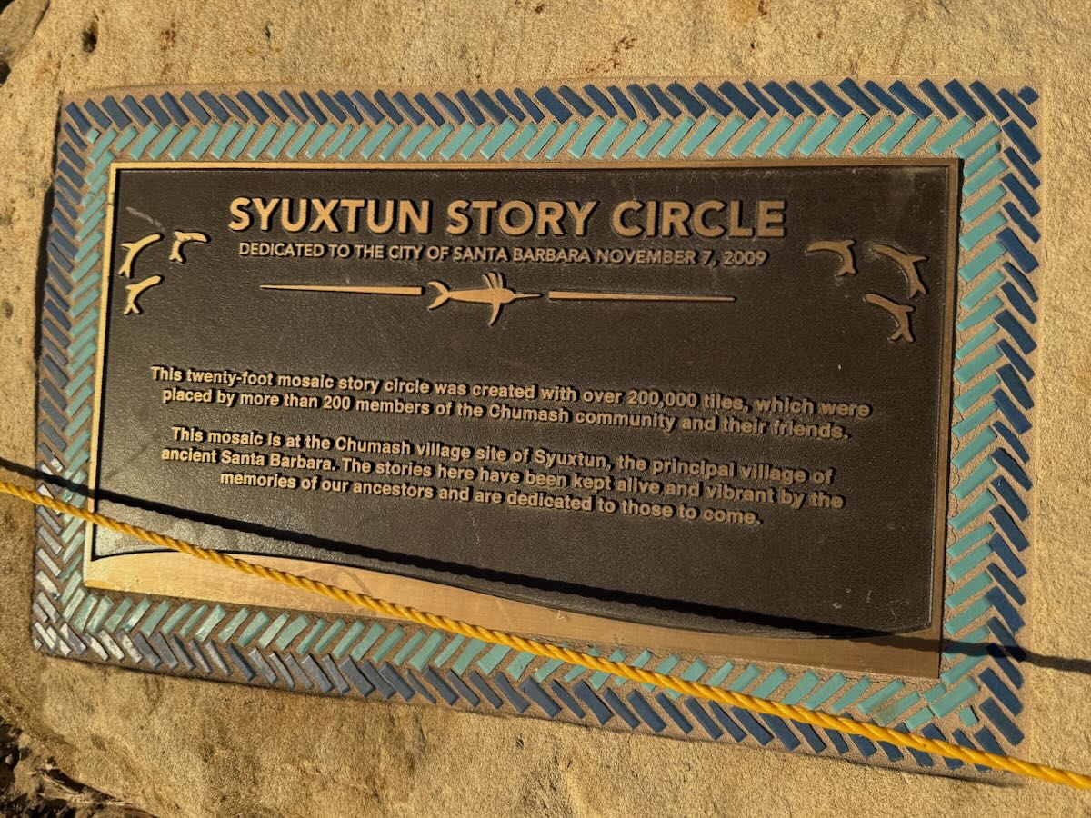 That’s the Syuxtun Story Circle, located across from Ambassador Park and Burton Mound. From a 2009 Independent article at the time: “The new 20-foot-wide mosaic […] sits upon the very location of the village of the same name, which was once the largest settlement in all of Chumash country, from the shores of San Simeon to the mountains of Malibu [is] comprised of about 200,000 unglazed ceramic tiles and the product of more than 5,000 collective hours of intense work by more than 100 people from a variety of backgrounds.”